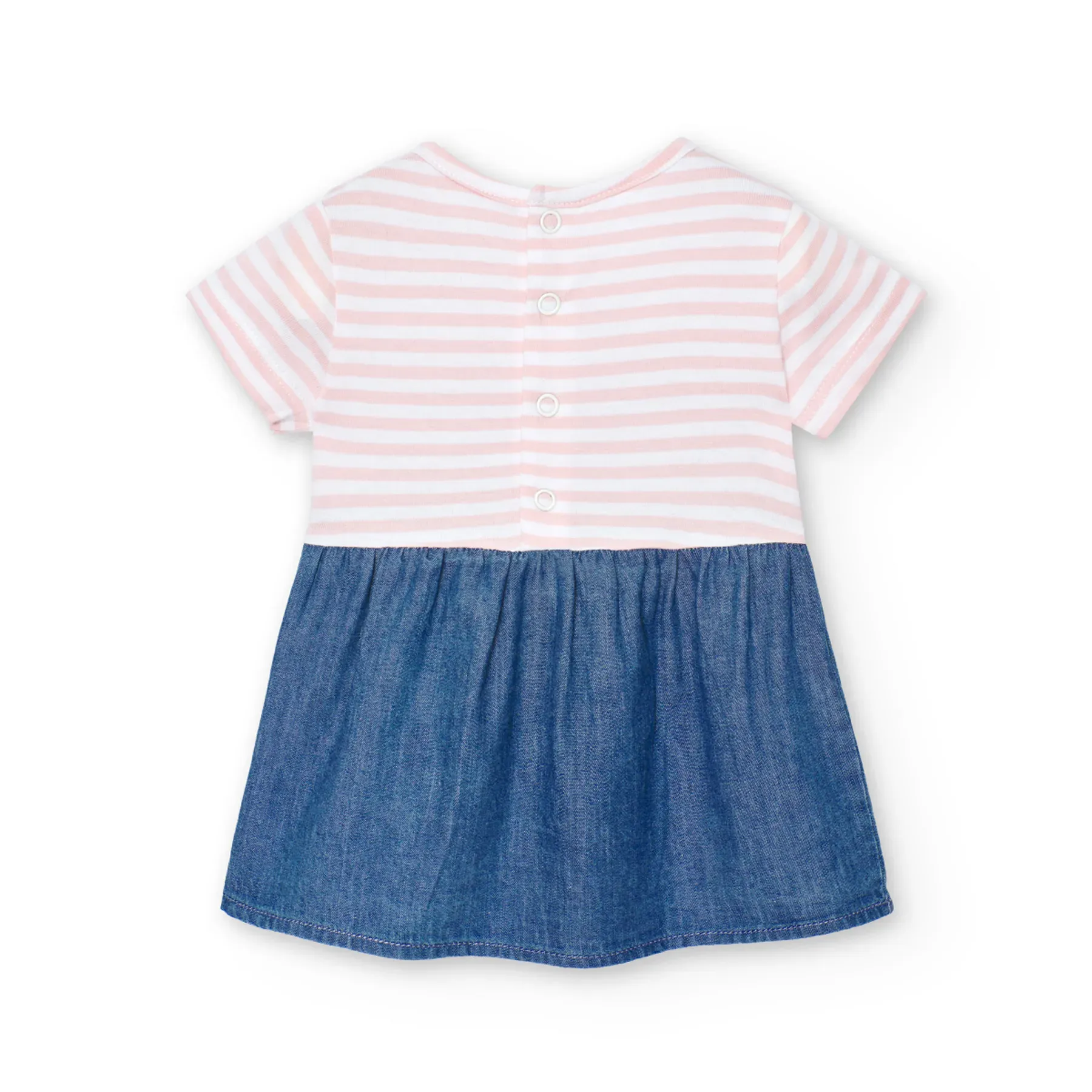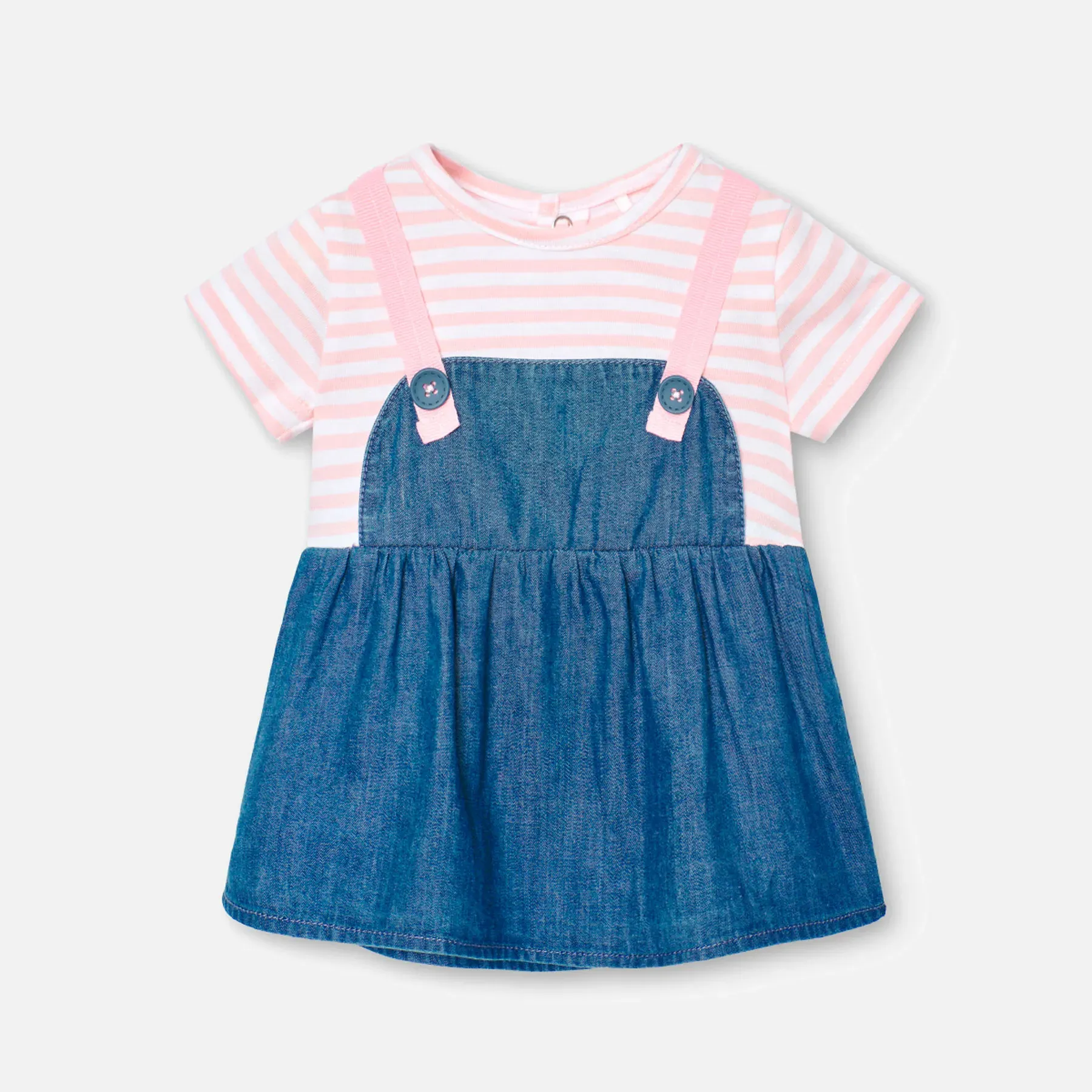 Este vestido denim combinado es la prenda perfecta para lucir un estilo moderno y casual. Con su diseño único y versátil, podrás crear looks únicos para cualquier ocasión. ¡Perfecto para tu bebe!